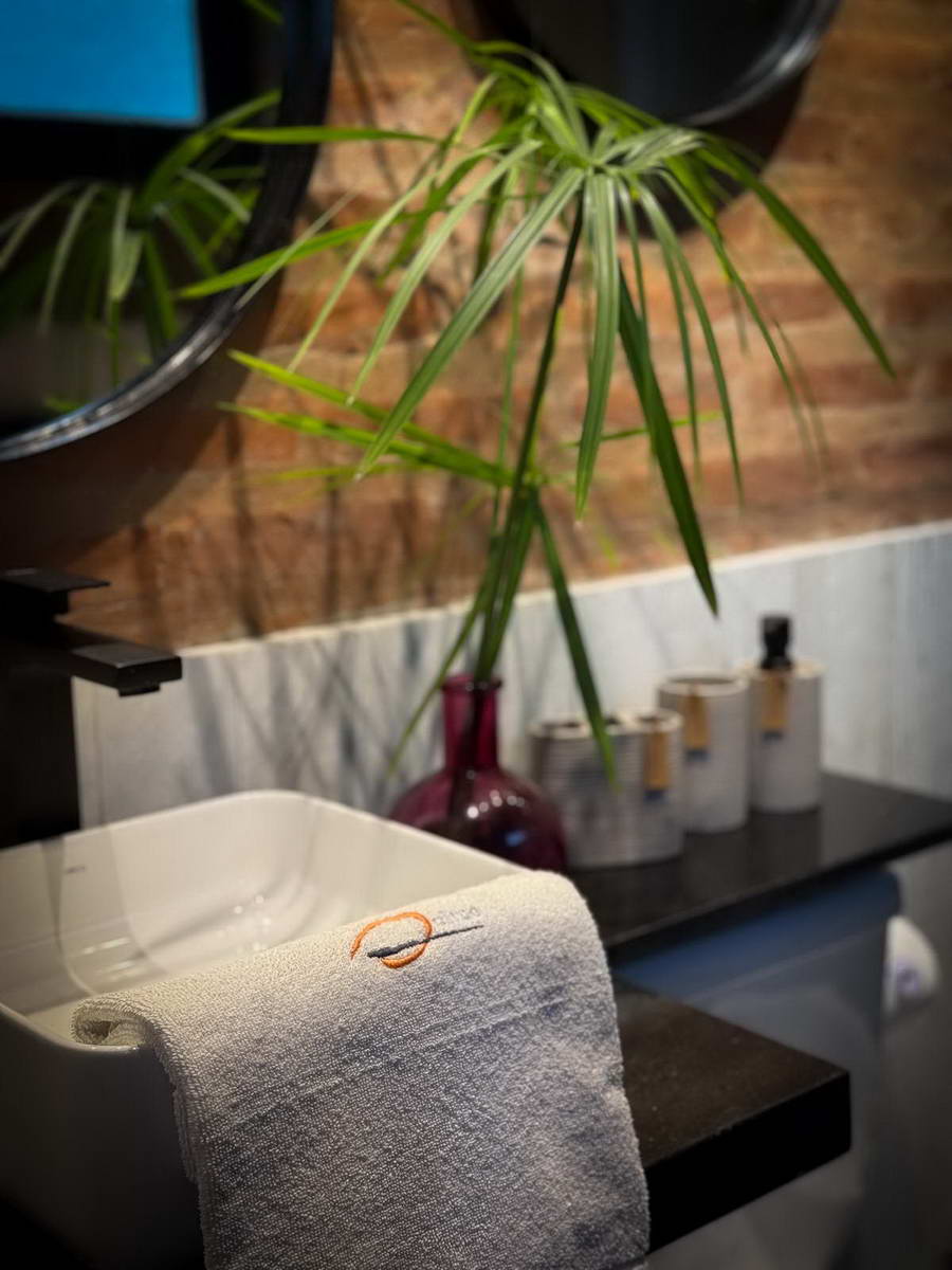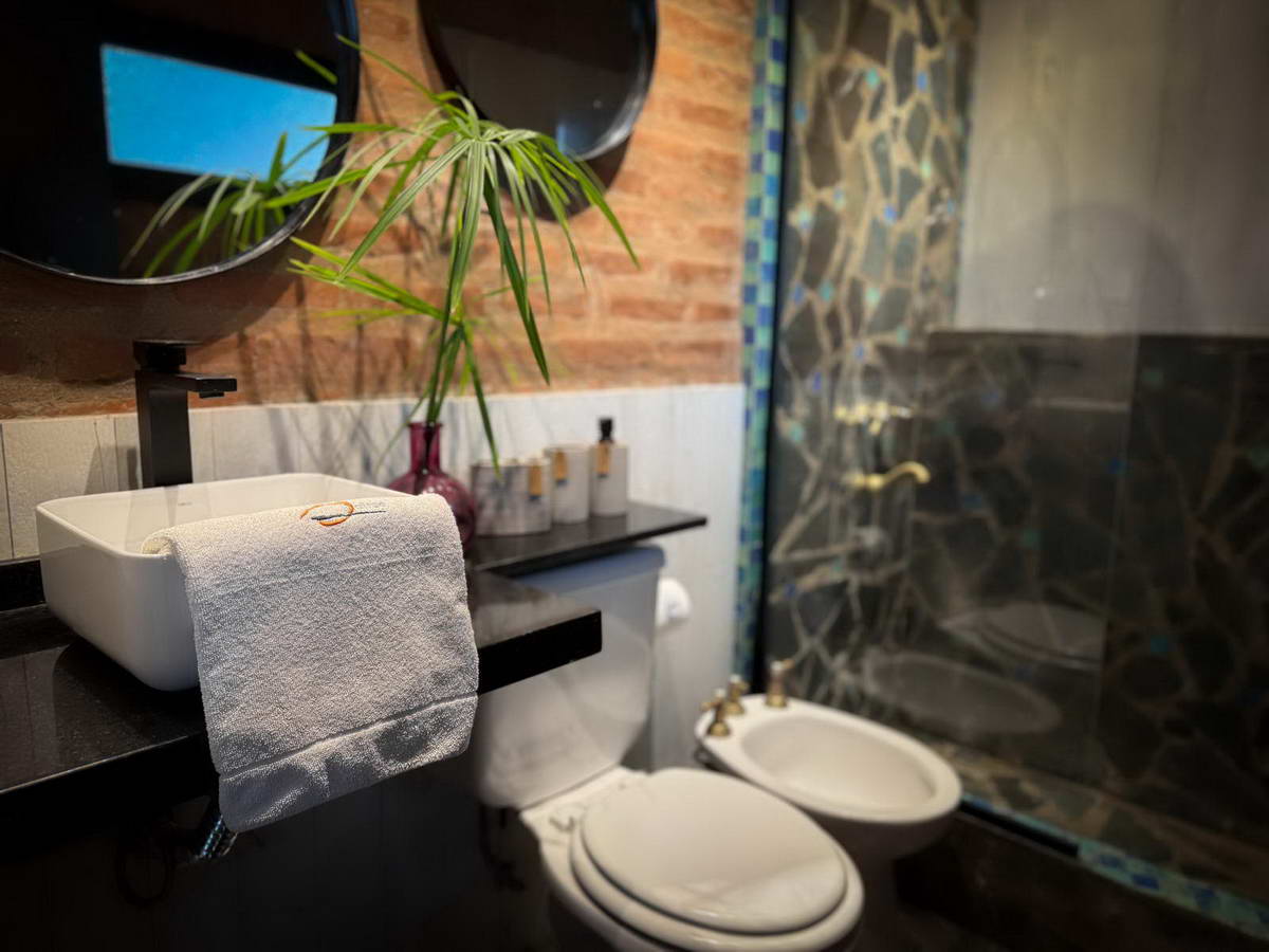 Baño completo con ducha y detalles de diseño que mantienen el espíritu cálido y natural del entorno.